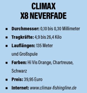 Noch bevor die nagelneue X8 Neverfade von Climax offiziell im Handel ist, könnt Ihr sie testen! Die Schnur verspricht absolute Farbstabilität – und wir schicken dafür 20 Spulen an den Start unseres Lesertests. Schnell sein lohnt sich: Jetzt Spule sichern und dabei sein!